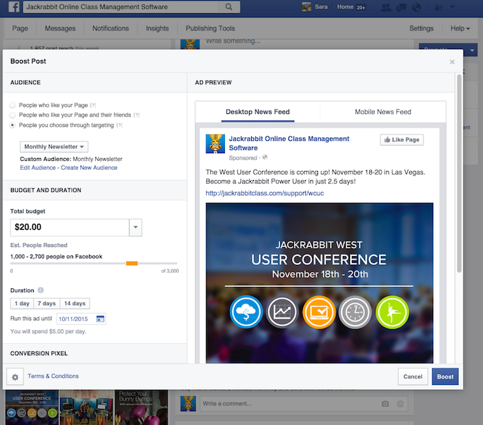 For this example, I targeted our monthly newsletter list which I uploaded in the Facebook Ads section. This is called a Custom Audience and you can get more info here.